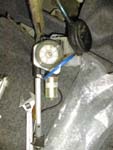 At this point you should have the entire assembly out of the compartment. The black wire that runs to the top of the mast is the signal wire from the antenna. This is attached to the body panel by a small clip, remove it with the pliers and disconect the wire (at the red plug in the picture). At the bottom of the antenna there is a drainage hose, just be carefull not to put any kinks in it.