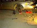 After the car has been jacked up, remove the rear tires and set them aside.