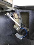 Here is where the fun begins. Open the trunk, and remove the jack from its compartment. If you look in the compartment and back to the left you will see the antenna. I sat there scratching my head about how to remove it (the Chilton's manual was no help) for a minute or two. The solution is to remove the two trim clips to the left of the jack compartment. Pull back the trip piece and you will see two screws at the bottom of the antenna (visible in the picture). Here is where the "stubby" phillips head screw driver comes in. I didn't want to remove the entire trip piece, so I squezed my hand in and tried to remove the screws, but I couldn't get enough torque at that angle to turn them. The solution, put the screw driver into the crescent wrench, now you have a "screw wrench". Works great. Take the screws out, and start coaxing the motor assembly out of the compartment. This takes some time. Be sure to unplug the two wire bundles that connect to the bottom of the white plastic box (the antenna timer).